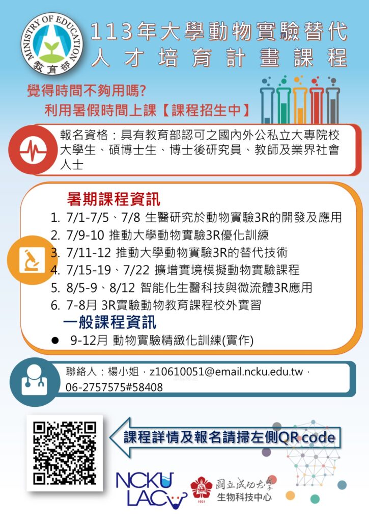 113年大學校院動物實驗替代科技人才培育計畫班 開始報名[招生資訊]