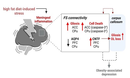 高脂飲食(high-fat diet)引發的肥胖會誘導中樞與周邊的發炎反應,伴隨星狀膠細胞 (Astrocytes) 和微膠細胞 (Microglia)的活化–神經膠細胞增生(gliosis)。臨床證據顯示,肥胖與憂鬱症相關;額葉-紋狀體迴路 (frontal-striatal connectivity;FS)亦與壓力性憂鬱症相關,此迴路涵蓋的腦區包含前額葉皮質(PFC)的前扣帶迴(ACC)與背側紋狀體尾狀核(CPu)。本篇文章研究慢性肥胖是否在這些腦區引發神經發炎反應。結果顯示,肥胖小鼠的腦膜淋巴系統(glymphatic system)出現免疫細胞聚集,並觀察到神經膠細胞增生和胼胝體(corpus callosum)膠細胞活化,伴隨髓鞘和寡突膠細胞(oligodendrocyte;OL)的減少。此外,在慢性發炎的病理條件下,前額葉皮質和尾狀核的水通道蛋白4 (AQP4) 表達減少,而作為細胞因子的CNTF基因表達上升,可能促使神經損傷並干擾腦部淋巴系統的正常功能。