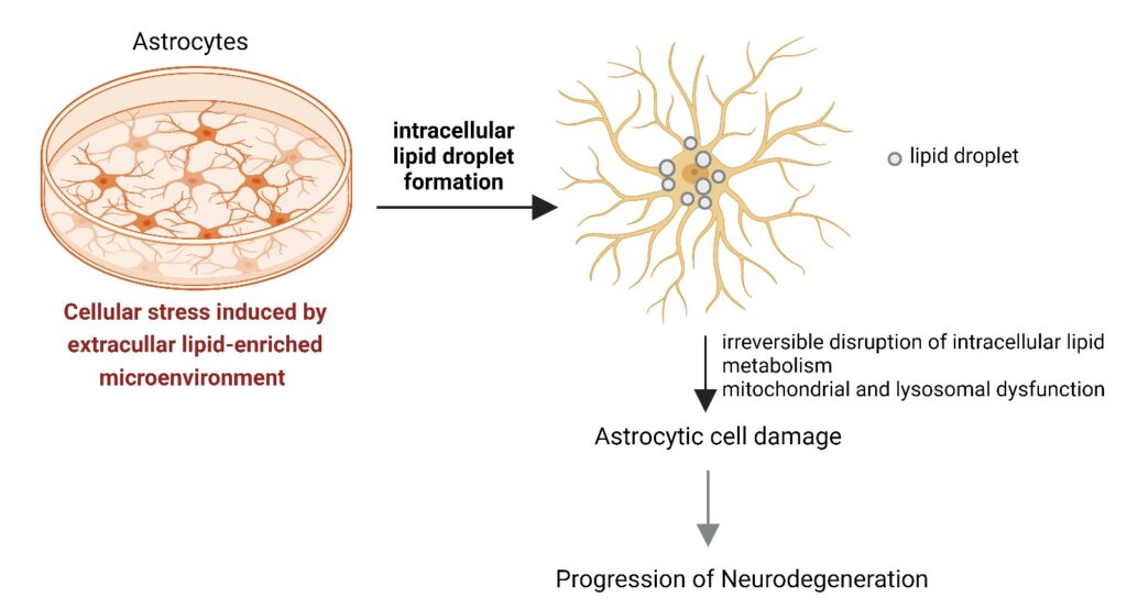 在中樞神經系統 (CNS) 中,星狀膠細胞 (astrocytes) 是主要的神經膠細胞,扮演多種角色,包括為神經元提供代謝支持、神經營養因子的提供、促進突觸神經傳遞物質的吸收、調節離子恆定以及參與突觸形成等功能。在多種神經系統疾病(如阿滋海默症,巴金氏症,多發性硬化症等)中觀察到腦部組織脂質累積的現象和神經元細胞與微膠細胞脂滴(lipid droplets)的形成,然而星狀膠細胞在高脂質微環境下的反應仍不清楚。在本篇研究中,我們使用新生大鼠皮質分離的初級星狀膠細胞,將其暴露於含膽固醇和多種脂肪酸的高濃度脂質混合物中,以探討星狀膠細胞的反應。研究結果顯示,高濃度脂質混合物處理導致星狀膠細胞中脂滴的累積,隨著暴露時間增長,脂滴的大小隨之增加。長時間高濃度脂質混合物處理導致細胞存活率明顯下降,而且細胞粒線體膜電位 (MMP)減少和成熟的凋亡誘導因子 (AIF) 表現量增加。在高濃度脂質混合物處理的星狀膠細胞中也觀察到較小的脂滴與微管相關蛋白1A/1B輕鏈3B (LC3) 和溶酶體相關膜蛋白-1 (LAMP-1) 共定位,且其溶酶體的酸性增加。這些結果顯示,在高濃度脂質微環境,導致星狀膠細胞中脂滴持續累積, 並伴隨線粒體和溶酶體功能的失調,這樣的干擾將影響星狀膠細胞脂質恆定,進一步阻斷其細胞功能和存活,阻礙其對神經元的保護作用。