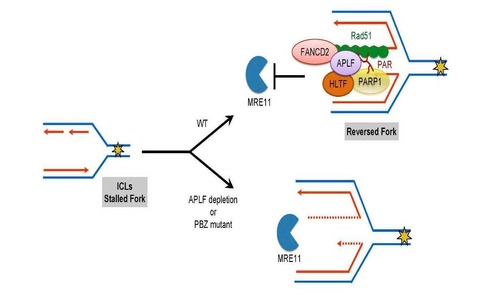 當 DNA 複製受到外源性或內源性的 DNA 損壞時,會造成 DNA 複製叉的停滯,此現象稱為複製壓力。複製壓力會將停滯的複製叉轉化為反向複製叉,這對於保護複製叉與維持基因體的穩定性是非常重要保護機制。矛盾的是,該機制也在癌細胞中起作用,造成癌細胞對各種 DNA 損傷藥物產生化學抗藥性。 我們先前的研究顯示 PARP1 對於反向複製叉的形成與維持基因體的穩定性具有非常重要的功能 (PLoS Genetics 18: e1010545)。PARP1 可以催化 poly(ADP- ribose)的形成於 PARP1 自身以及目標蛋白上,APLF 透過 PBZ 結構域與 poly(ADP-ribose) 結合,並且已知主要參與非同源末端連接 (NHEJ)修復路 徑。 在這篇研究中,我們與臨醫所蘇文彬教授合作,博士生吳政桂(共同指導),以及許嘉麟博士,與何彥志博士發現了 APLF 的新功能,參與 DNA 交聯修復和複製叉的保護機制。 我們發現 PARP1 促進 APLF 招募到停滯的複製叉上,從而使 FANCD2 招募到停滯的複製叉。 降低 APLF 的表現會使細胞對順鉑敏感,損害交聯修復,減少 FANCD2 向停滯複製叉的募集,最後導致 MRE11 核酸酶降解 DNA 複製叉。 此外,順鉑抗藥性癌細胞表現出過量的 APLF 和同源重組相關基因。 降低 APLF 的表現使細胞對順鉑敏感並導致複製叉的降解。我們的研究結果揭示了 APLF 促進交聯修復和複製叉保護的新功能,有助於我們對於癌細胞的抗藥性機制的了解以及未來開發新的標靶藥物的研發。