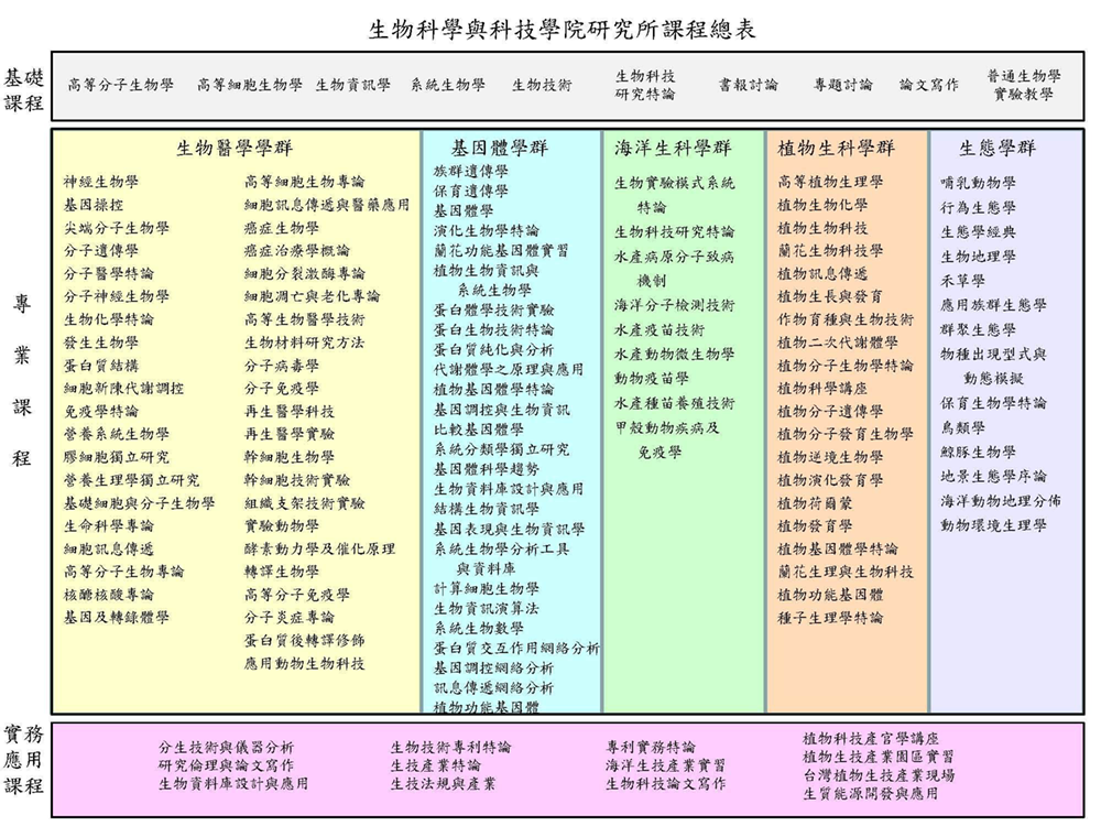 本系研究生的學程是由導師、指導教授和研究生委員會規劃。研究生必須修習基本的生物學素養課程,培養宏觀視野,進而修習專門領域課程以窺生物科學的精奧。故而本系的課程規劃在精神上是宏觀與微觀兼容,理論與實際並重的模式。研究生必須修完規定科目及學分(不含論文),方得提出學位考試。依本校110年第1次課程委員會:「本校自111年度起入學之博、碩士生應於畢業前修畢研究生通識,其中學術倫理至少6小時,中英文寫作能力及溝通表達至少各1小時。」